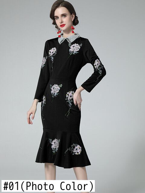 ランウェイラペルカラーフラワー刺繍パーティードレスマーメイドドレス フラワーデザイン