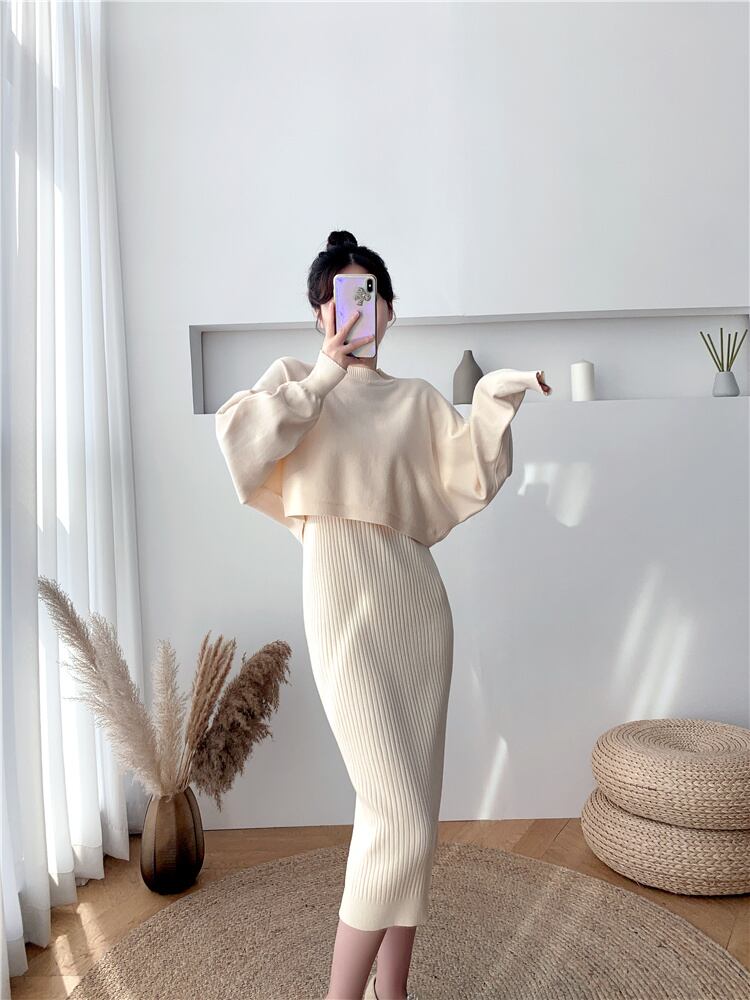SMTHMA 秋冬 バットスリーブ Oネック ソフトセーター + レディース ニットベスト ロングワンピース ツーピースワンピース セット ウィンター 冬物