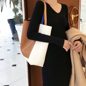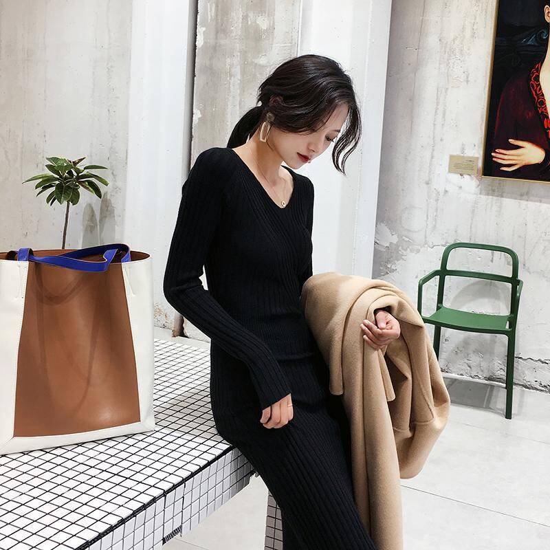 SMTHMA タイト フィット ニット ドレス セクシーな V ネック プルオーバー ロング秋冬トレンド ドレス オータム 秋物 ウィンター 冬物 Vネック