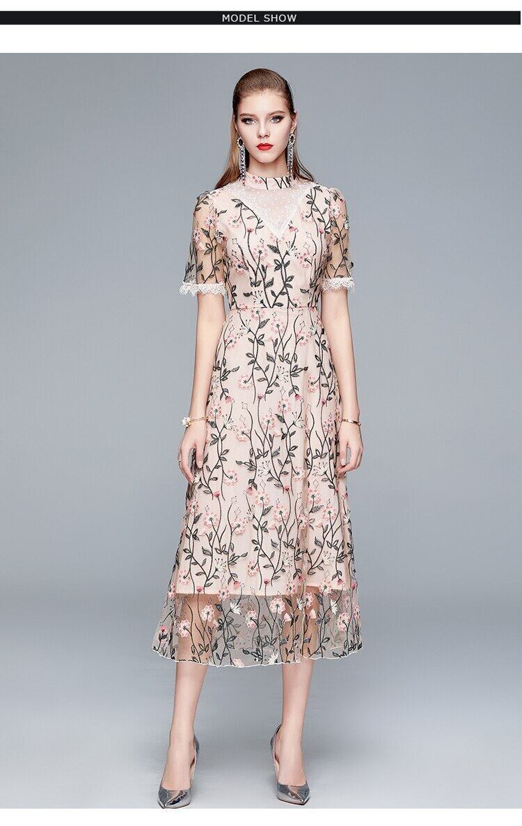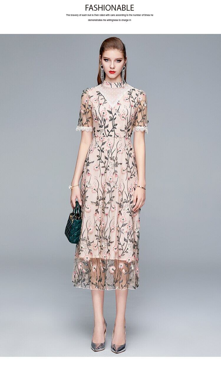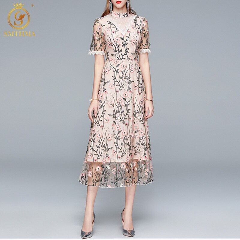 SMTHMA 夏滑走路ドレス女性半袖メッシュ刺繍ロングドレス Vestidos ショート ハーフスリーブ サマー 夏物