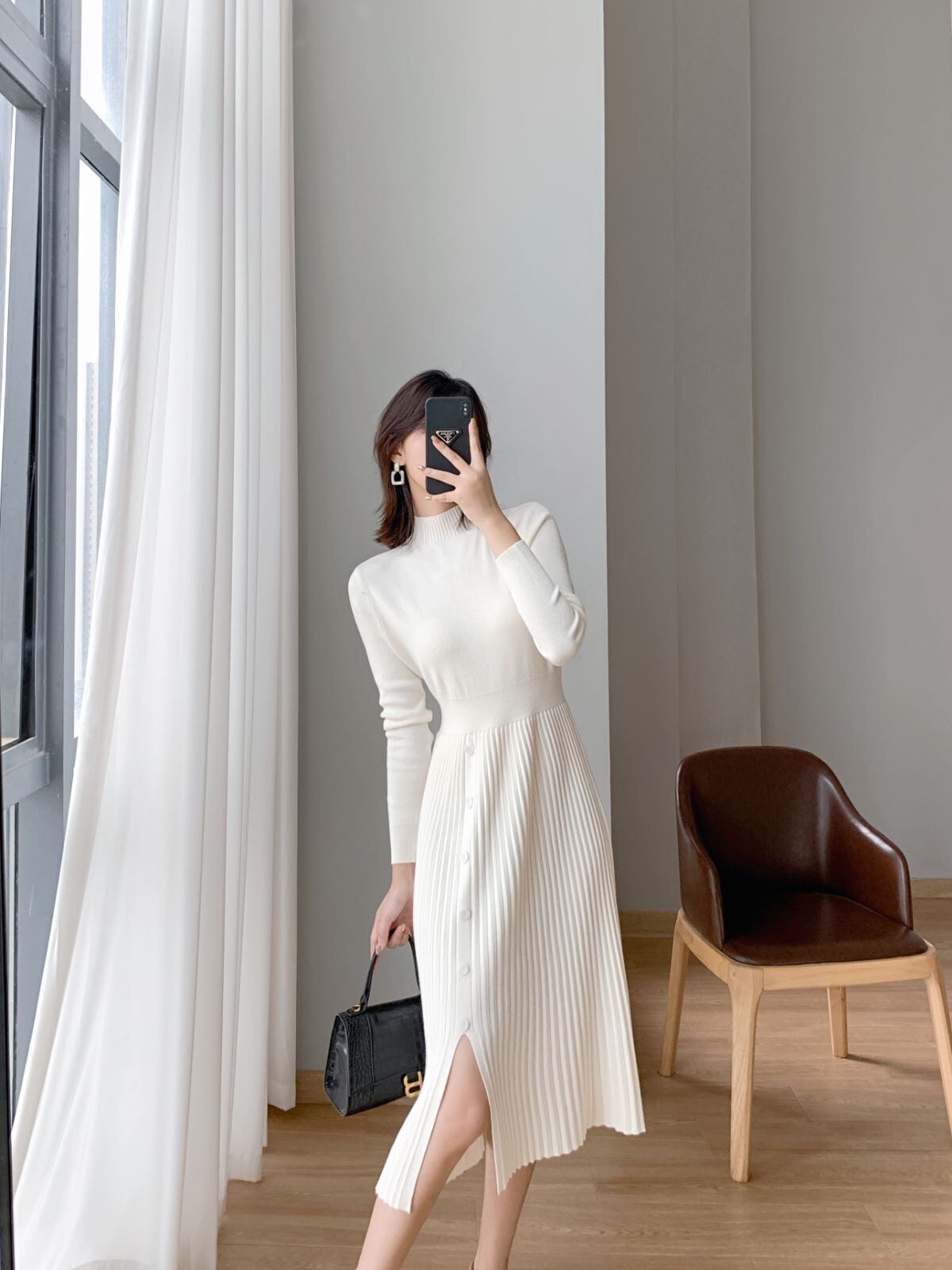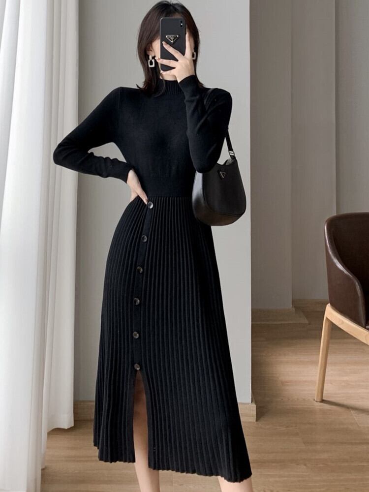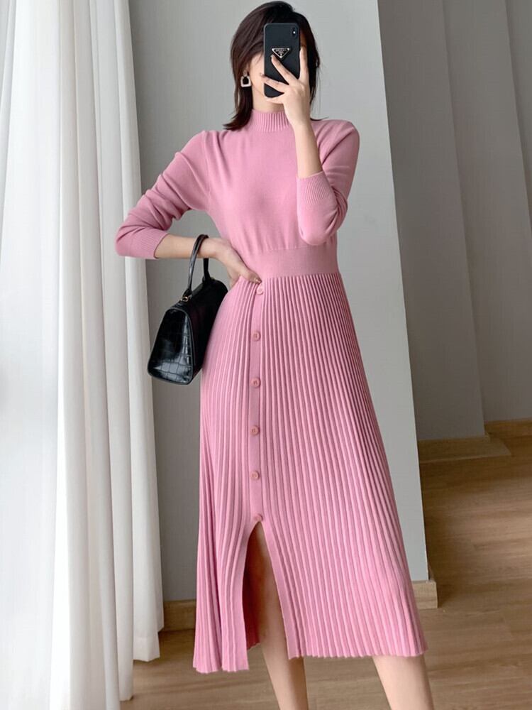 SMTHMA ハーフカラー ニットワンピース フルスリーブ シングルブレスト スリム 無地 セーターワンピース ソリッドカラー
