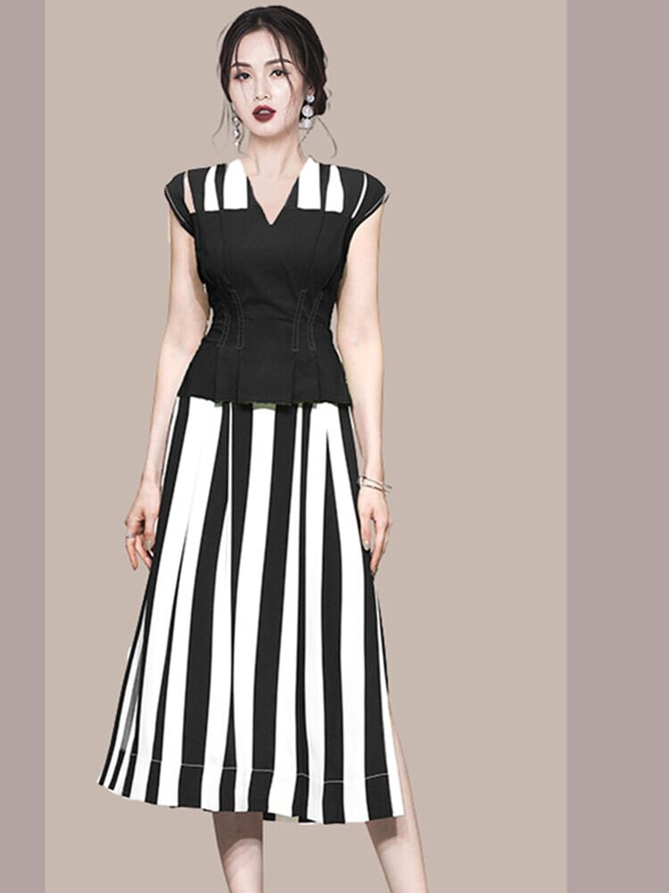 SMTHMA V ネック サマー ドレスの女性のノースリーブ黒と白のストライプのパッチワーク スリム ドレス Vestidos ホワイト ブラック 夏物 Vネック
