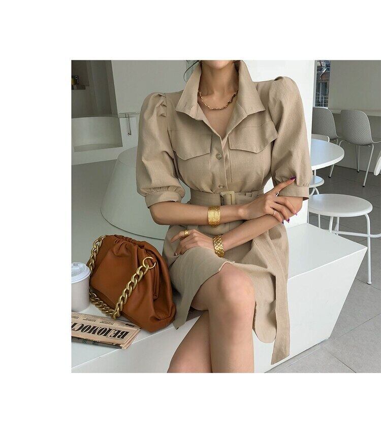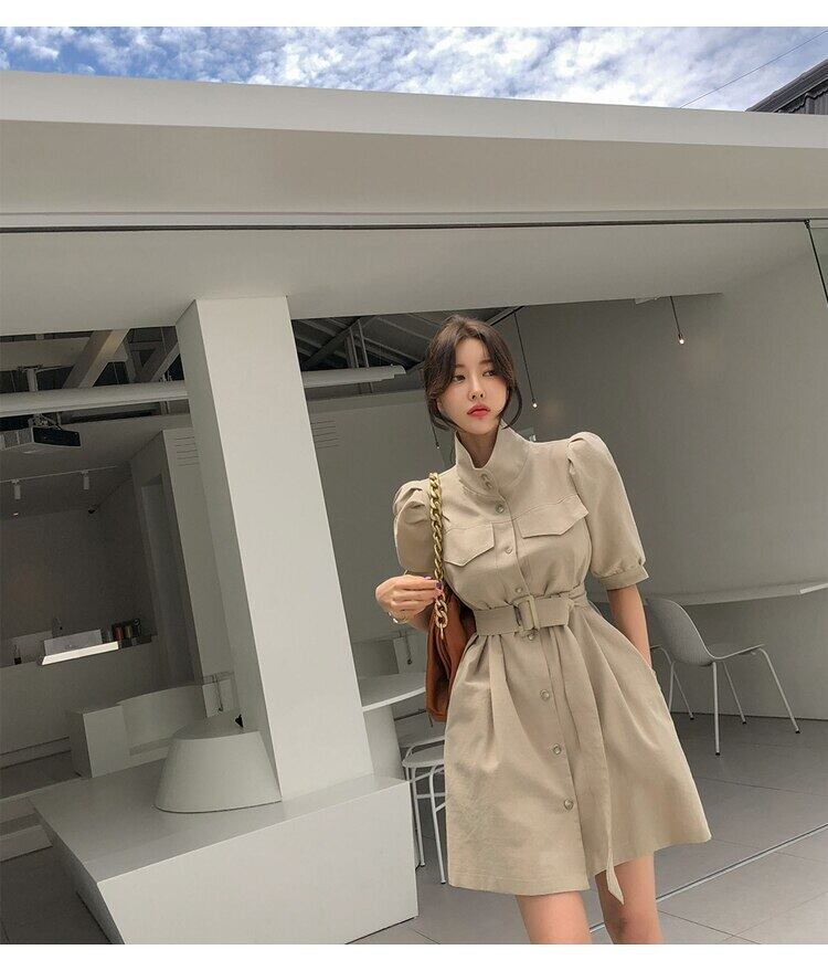 SMTHMA 女性シックなサマードレスフレンチスタンドカラーシングルブレスト半袖ベルトドレス Vestido ショート ハーフスリーブ 夏物 ハーネス