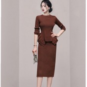 SMTHMA 秋冬 ストレッチ ニット フリル トップス + ミッドカーフ スカート 衣装 ツーピース レディース セット オータム 秋物 ウィンター 冬物