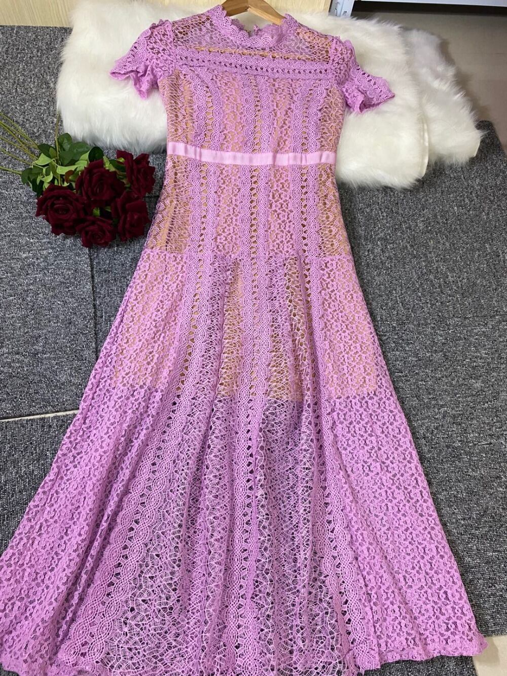 SMTHMA 高級滑走路ドレスの女性の夏のレースのパッチワーク半袖ピンクパープルドレス ショート ハーフスリーブ サマー 夏物