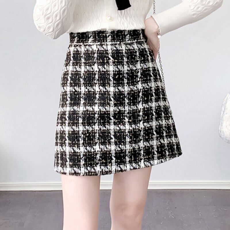 SMTHMA 秋冬チェック柄ツイードスカートレディースウエストウールミニスカートサイア オータム 秋物 ウィンター 冬物