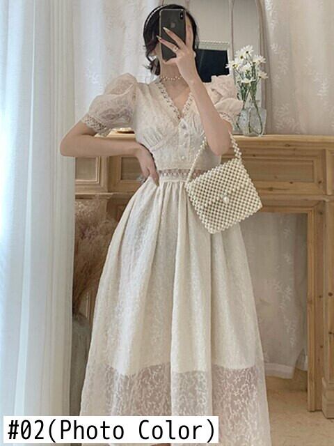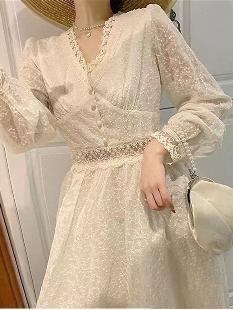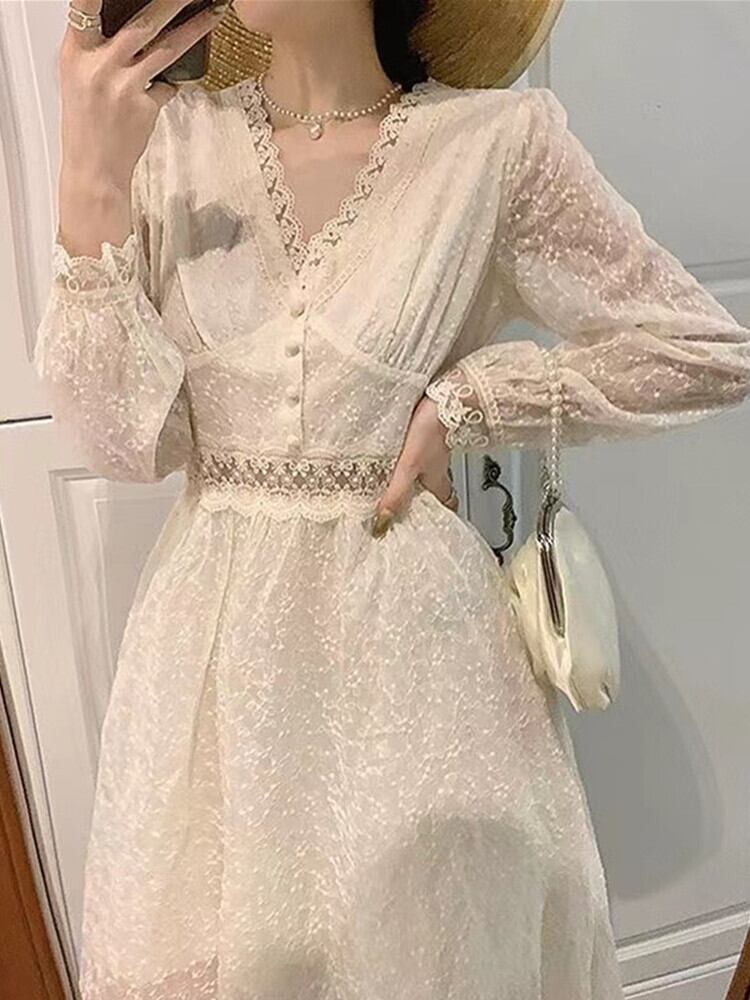 SMTHMA 春ののメッシュ刺繍ドレス V ネック長袖スウィートビッグスイングレースパーティードレス Vestidos ロング 大人ガーリー キュート カジュアル スプリング 春物 Vネック | two