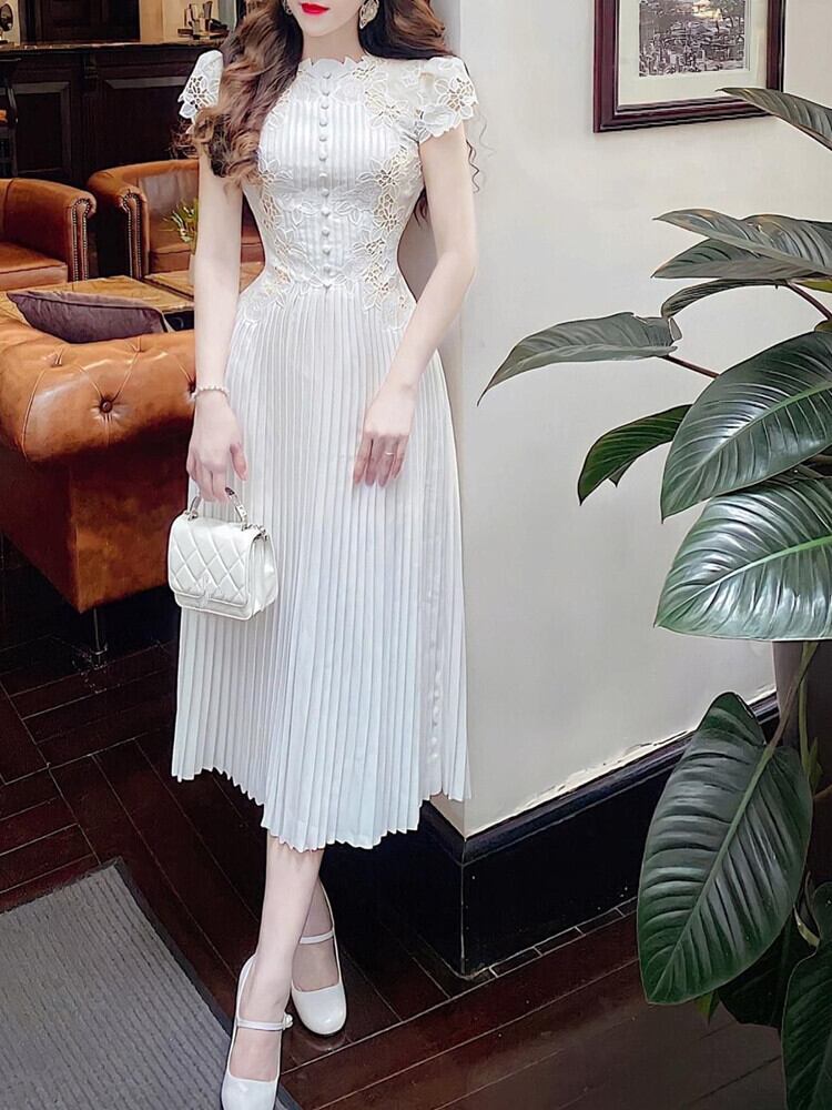 SMTHMA ランウェイ サマー ドレス レディース ホワイト レース ローズ フラワー 刺繍 半袖 綺麗め ロングドレス ショート ハーフスリーブ 夏物 フラワーデザイン