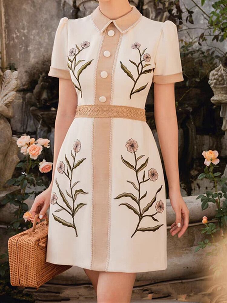 SMTHMA 絶妙刺繍花ドレスラペル半袖ウエスト サマー ドレス ショート レッド ハーフスリーブ 夏物 フラワーデザイン