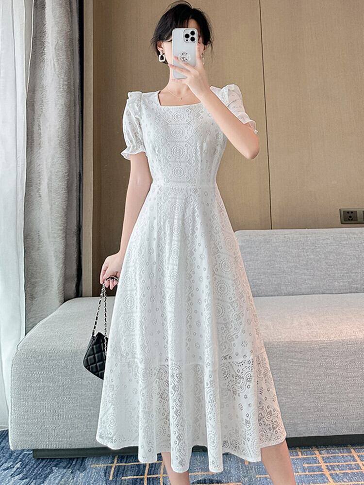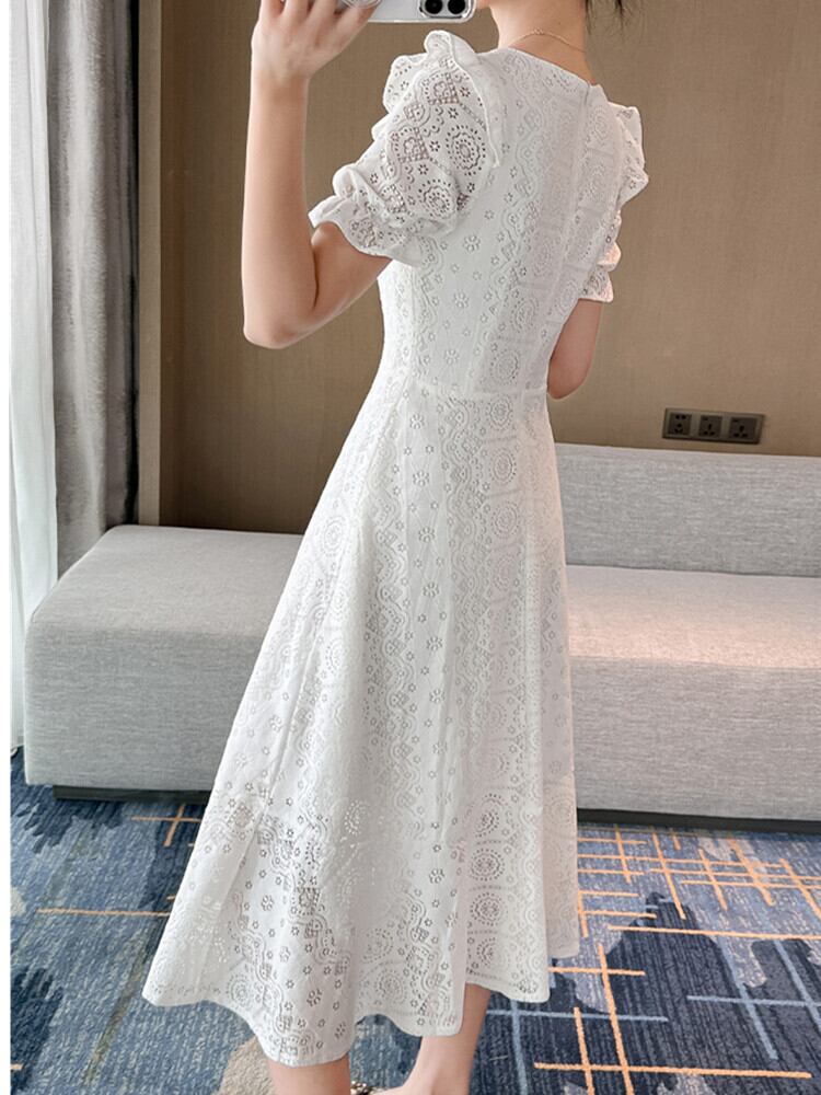 SMTHMA ミディレトロフレンチスタイル A ラインサマードレス Vestdios レース中空アウト服 夏物 Aライン