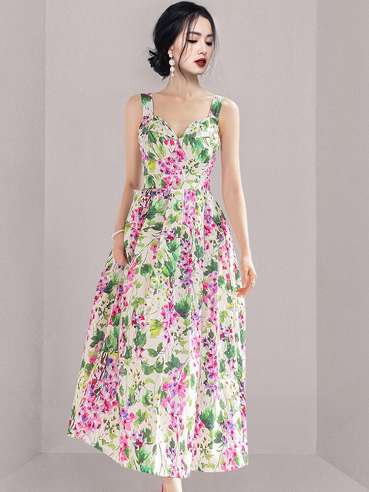 SMTHMA スタイルサマーロングドレスセクシースパゲッティストラッププリントビッグスイングドレス 夏物