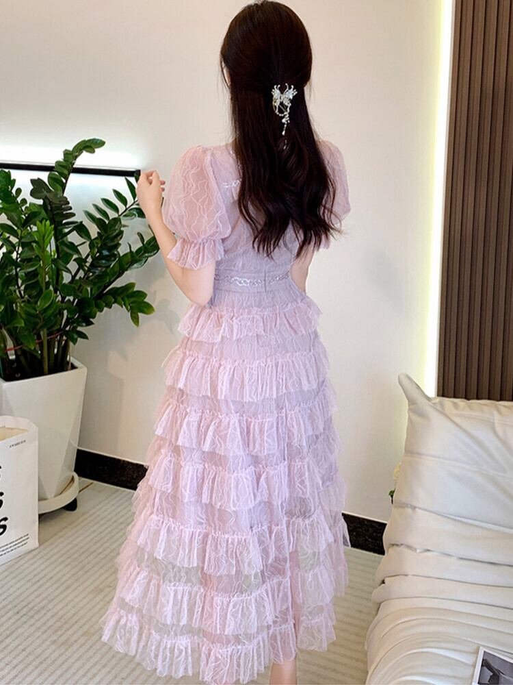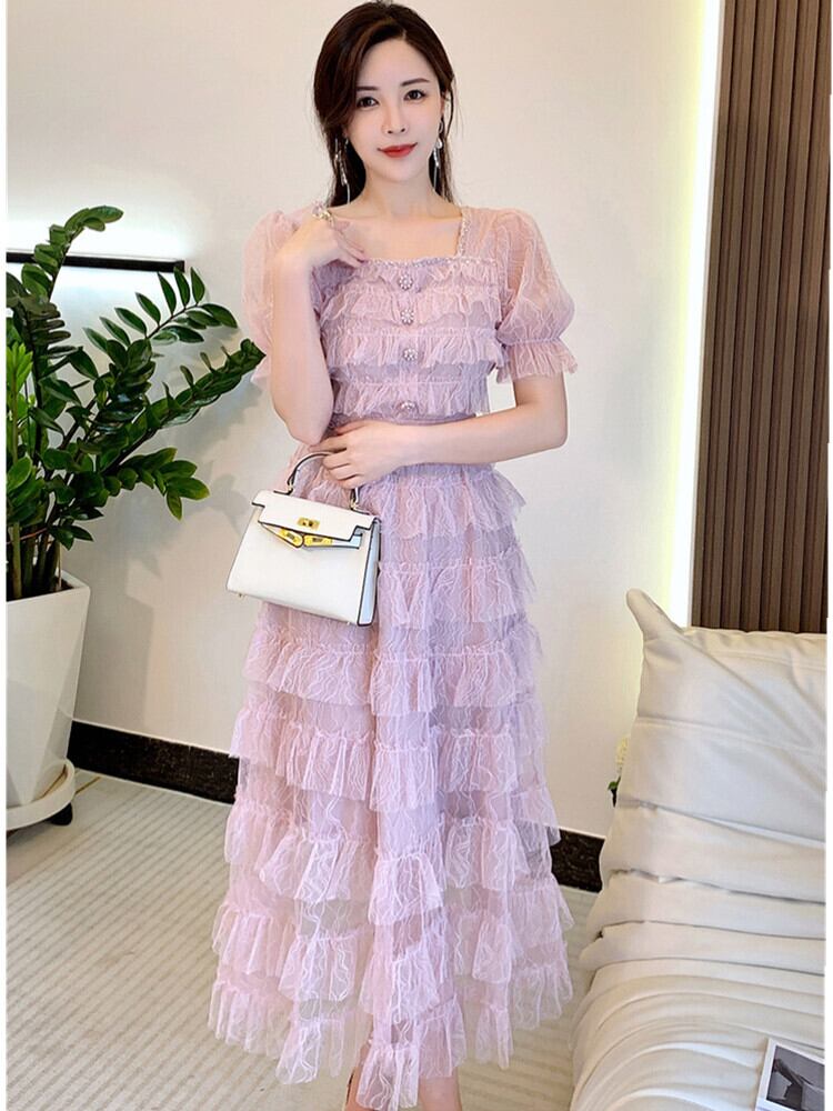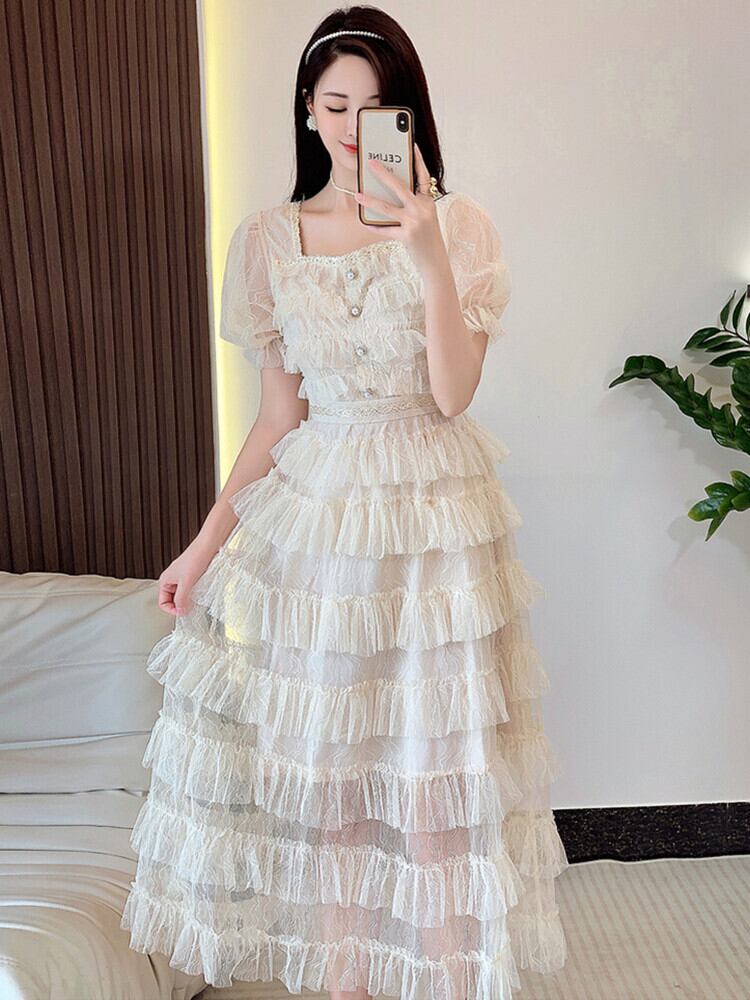 SMTHMA フレンチスイート気質スクエアネックパフ半袖ドレス夏フリルケーキレースロングドレス ショート ハーフスリーブ 大人ガーリー スウィート キュート カジュアル サマー 夏物 スクウェア | two