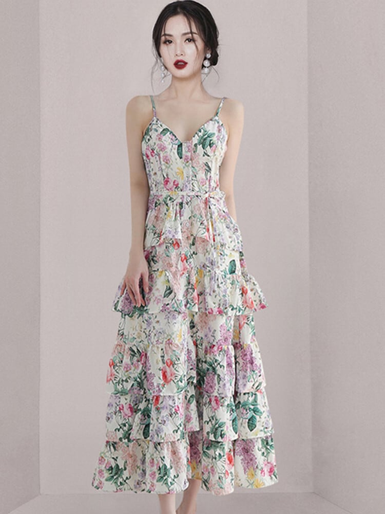 SMTHMA シングルブレスト夏セクシースパゲッティストラップドレスプリントフリルビッグスイングロングドレスローブ サマー 夏物
