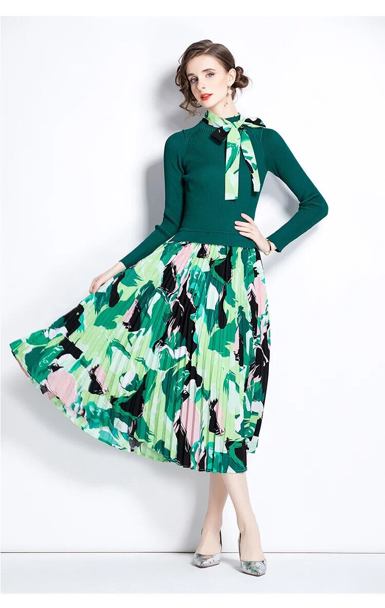 秋冬 O ネック セーター パッチワーク プリント レースアップ フルスリーブ ドレス レディース プリーツ パーティー ドレス ベルト付き オータム 秋物 ウィンター 冬物 ハーネス Oネック | two