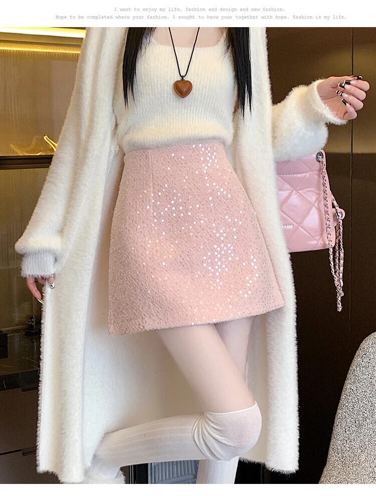SMTHMA スパンコールウールスカート レディース 秋/冬 ウエストスリム Aラインスカート ラップヒップスカート ショートスカート オータム 秋物 ウィンター 冬物