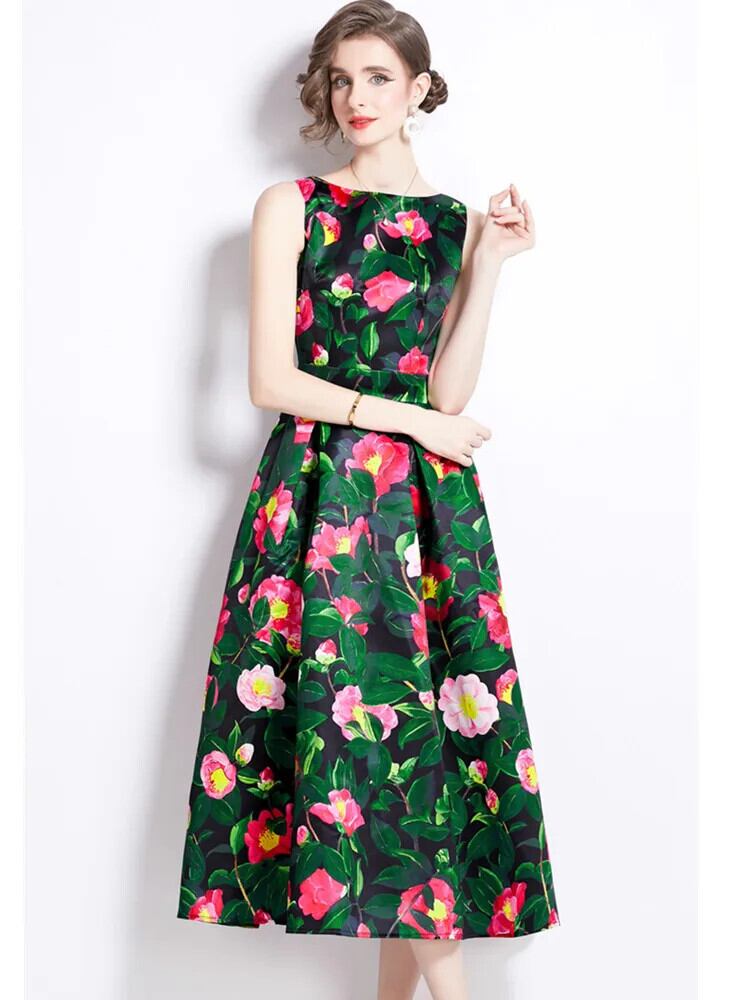 SMTHMA 春夏ノースリーブ O ネックフラワープリントミドル丈ドレスレディースレディオフィスワークドレス スプリング 春物 サマー 夏物 Oネック フラワーデザイン 会社 学校 通勤や通学にも | two