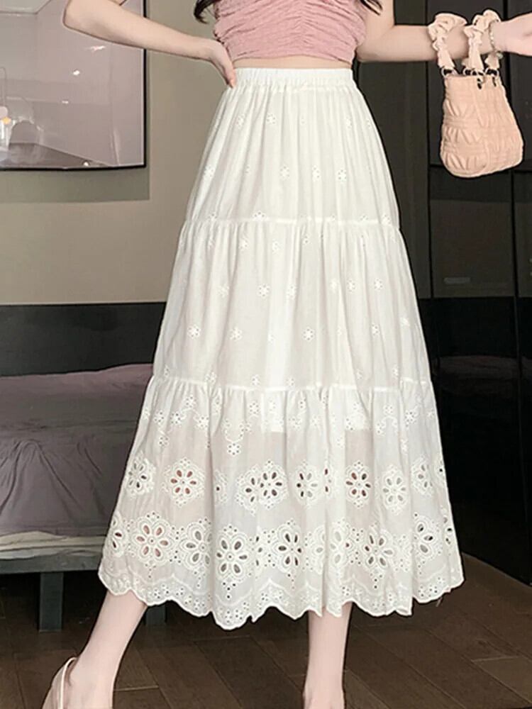 SMTHMA 綿アウトロングスカート刺繍レースアップ A ライン甘い弾性 t ウエストプリーツスカート コットン エラスティック 伸縮 大人ガーリー スウィート キュート カジュアル Aライン | two