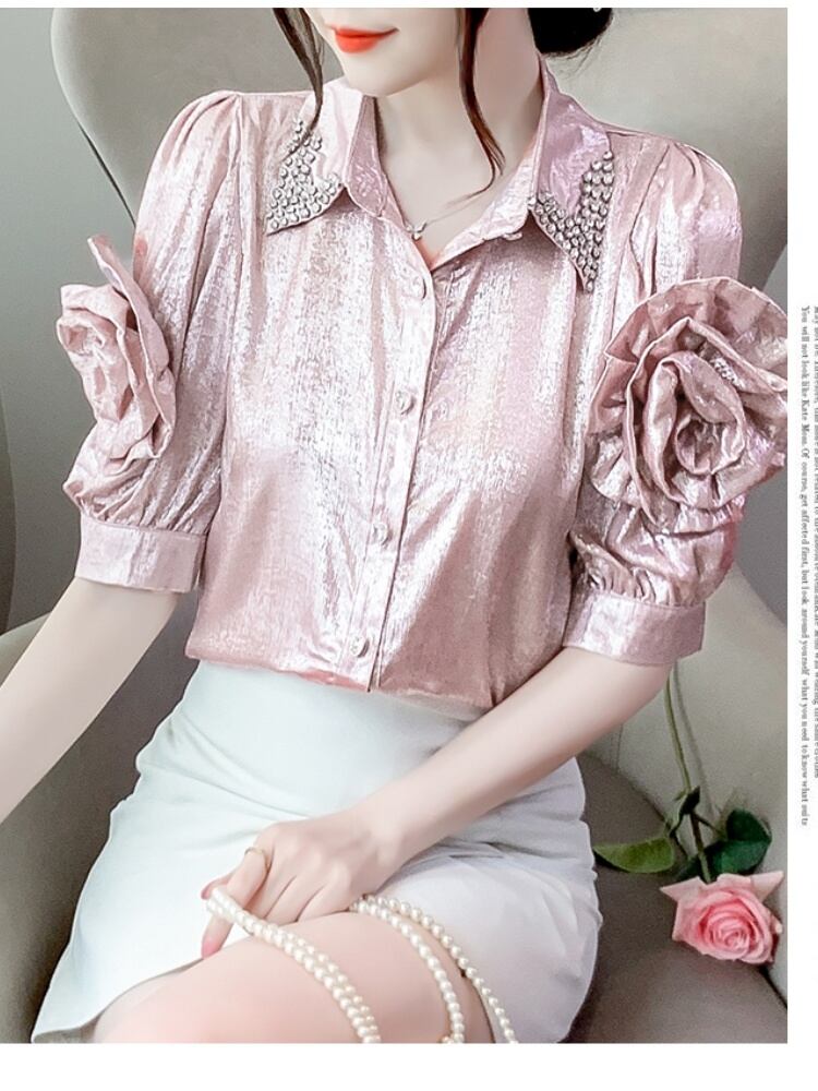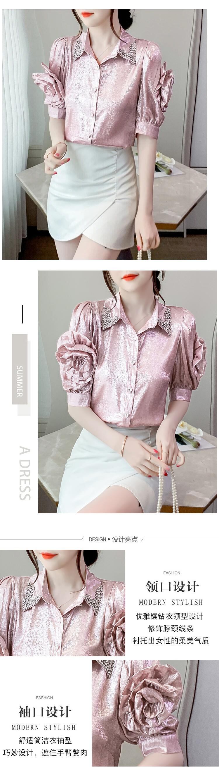 Smthma 2024 neue Sommer hemd Mode 3d Blumen dekoration Puff kurze Ärmel r Luxus dekoration Diamant Revers Bluse | two