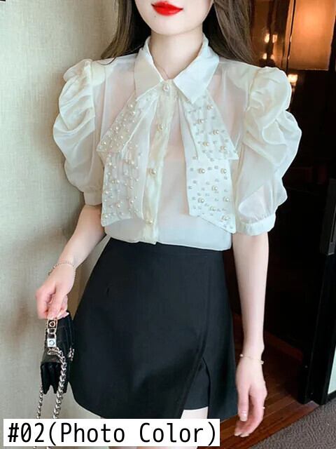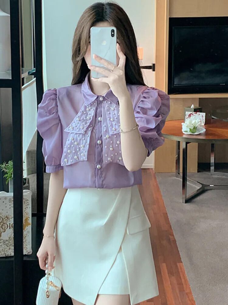 Smthma 2024 Sommer neue koreanische kurz ärmel ige Puff kurze Blase Ärmel Hemd Damenmode Turndown Kragen Perlen シフォン シャツ | two
