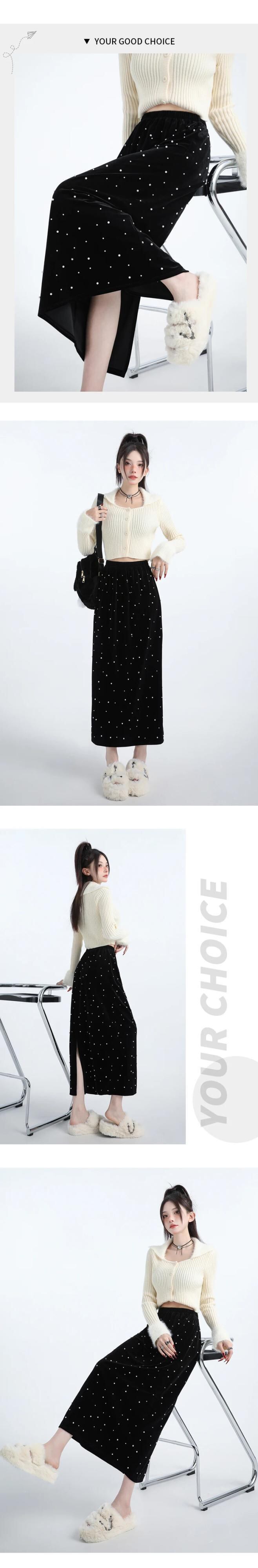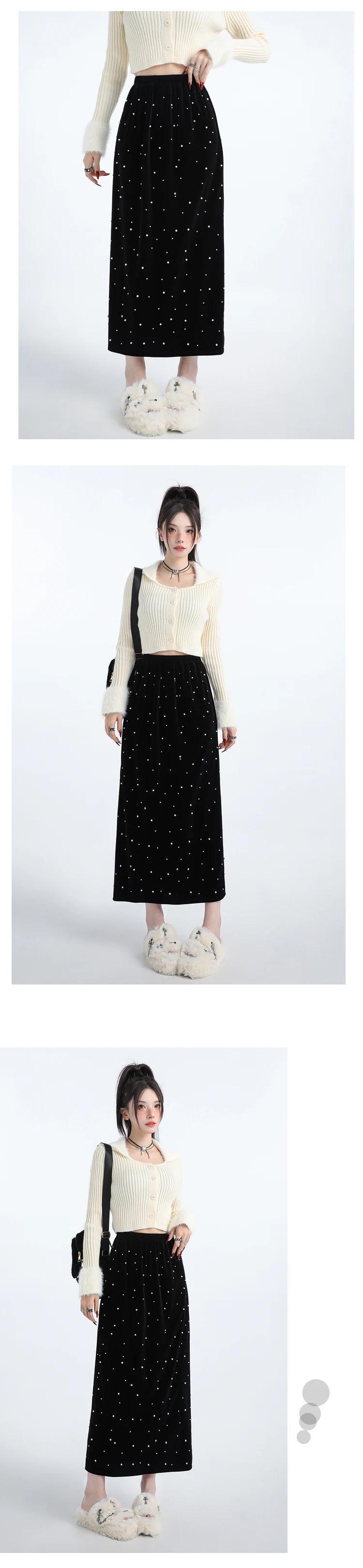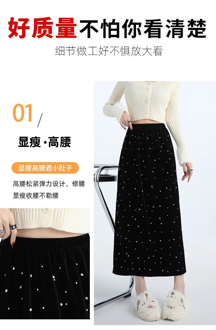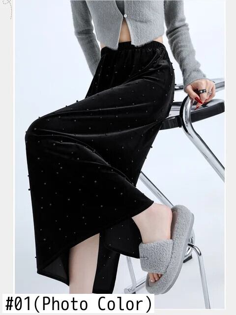 Smthma Luxus Perlen Samtrock für Frauen Herbst Winter hohe Taille gerade A-Linie langen Rock ウィンター 冬物 | two