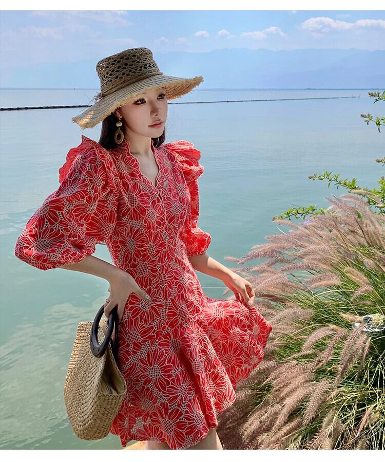 Smthma Nieuwe Mode Franse Temperament V-Hals Geborduurde Bloem Zomerjurk Vrouwen Poff Korte Mouwen Ruche Vakantie Jurk | two