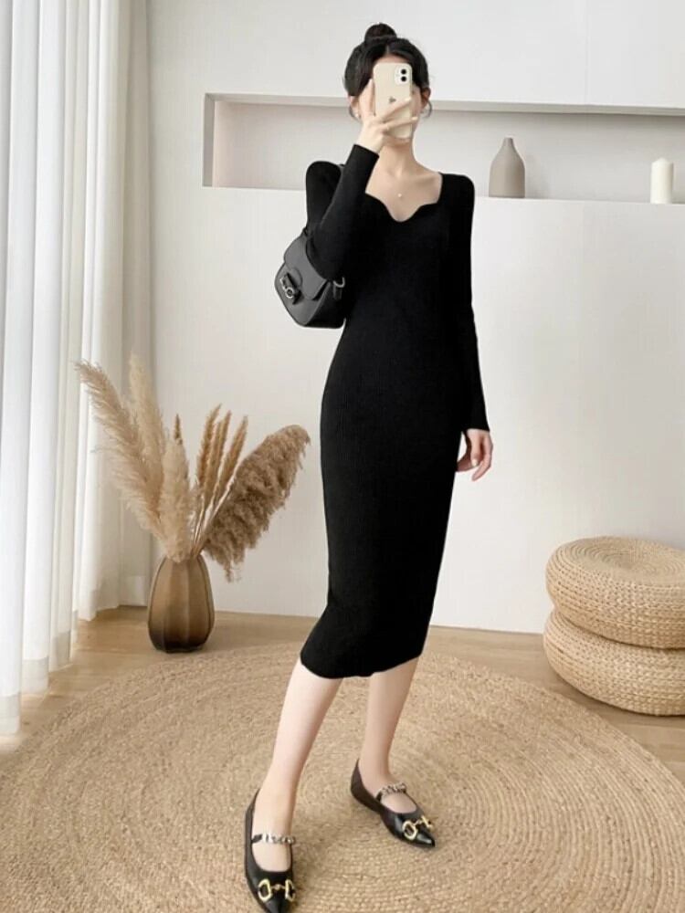 Smthma 2024 Herbst/Winter Französisch knielangen プルオーバー Kleid leichte reife セクシー Tasche Hüfte Innen boden Strickkleid für Frauen ウィンター 冬物 | two