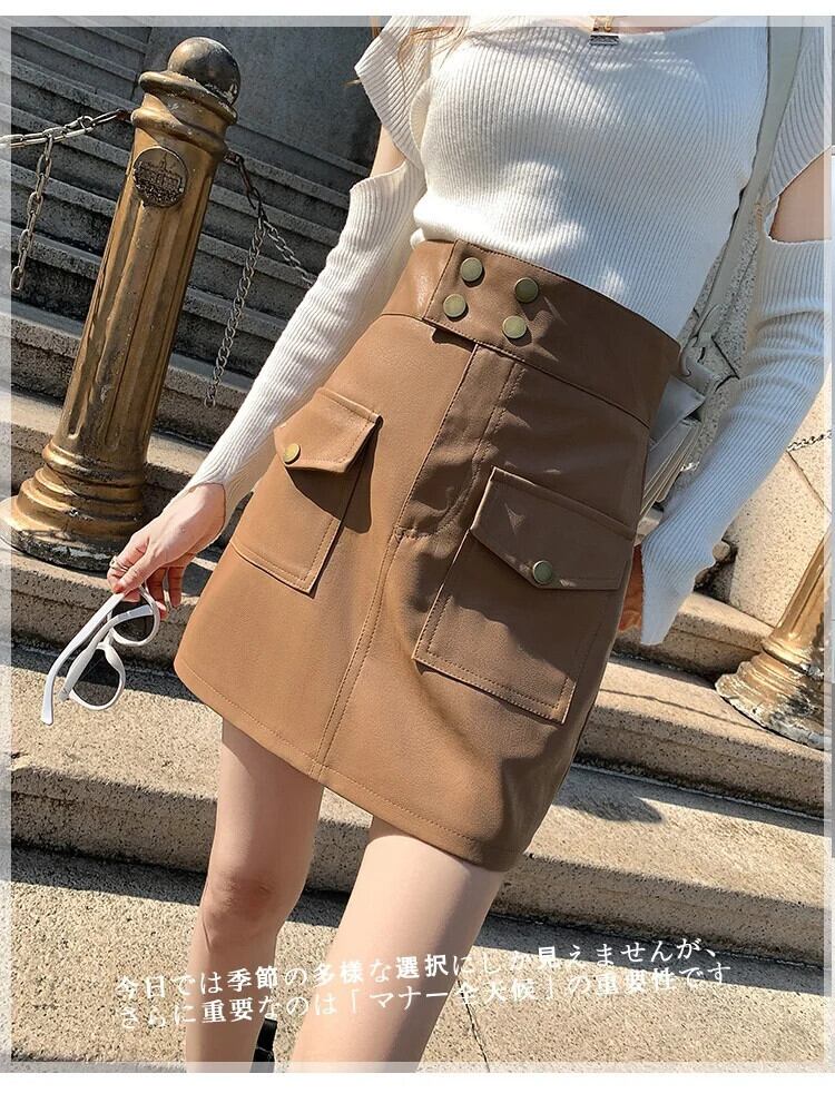 Smthma Herfst/Winter Nieuwe Hoge Taille Afslankende ボディコン Korte Rok A-Line Pu Leren Rok Voor Vrouwen Kleding Met Zak ウィンター 冬物 Aライン | two